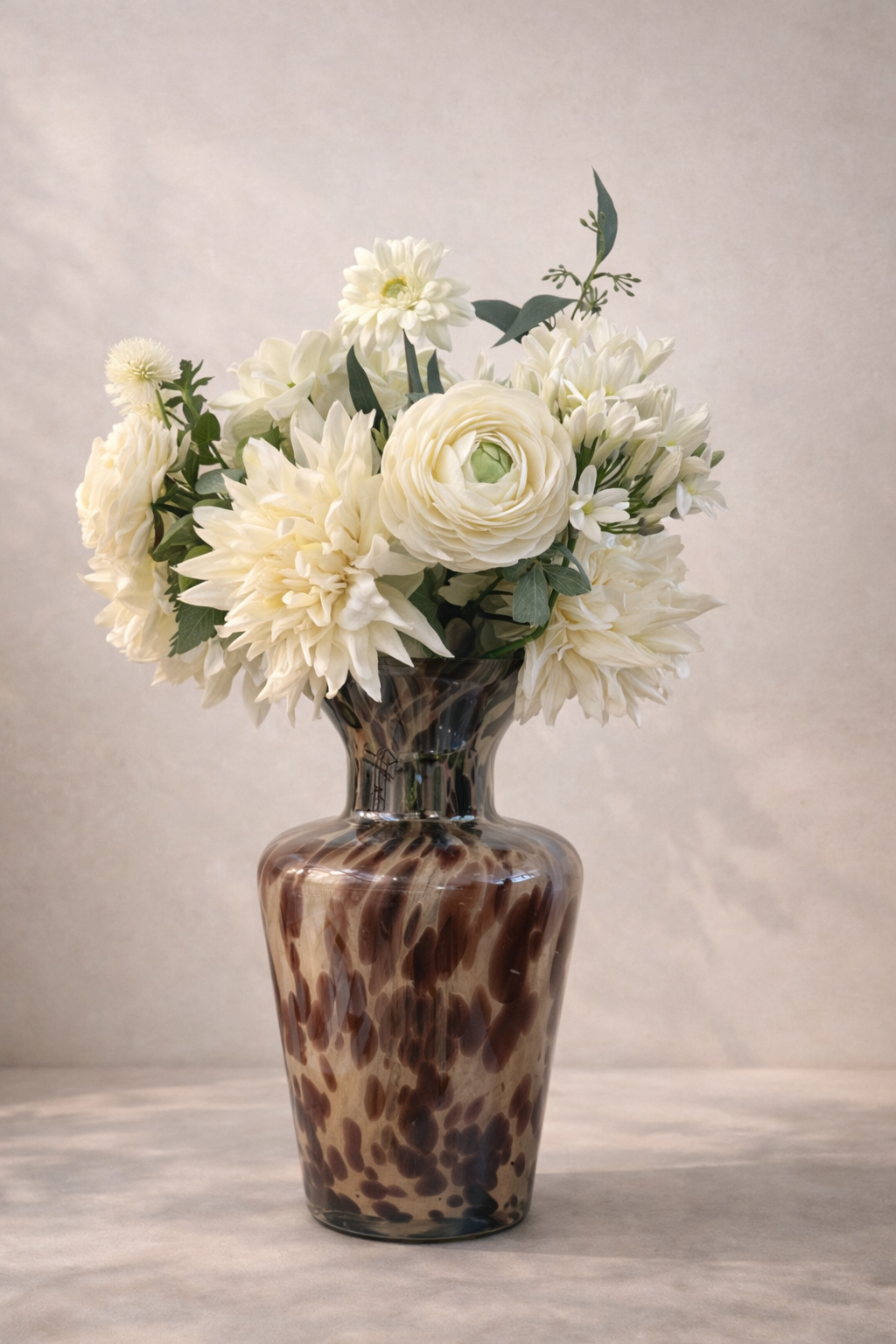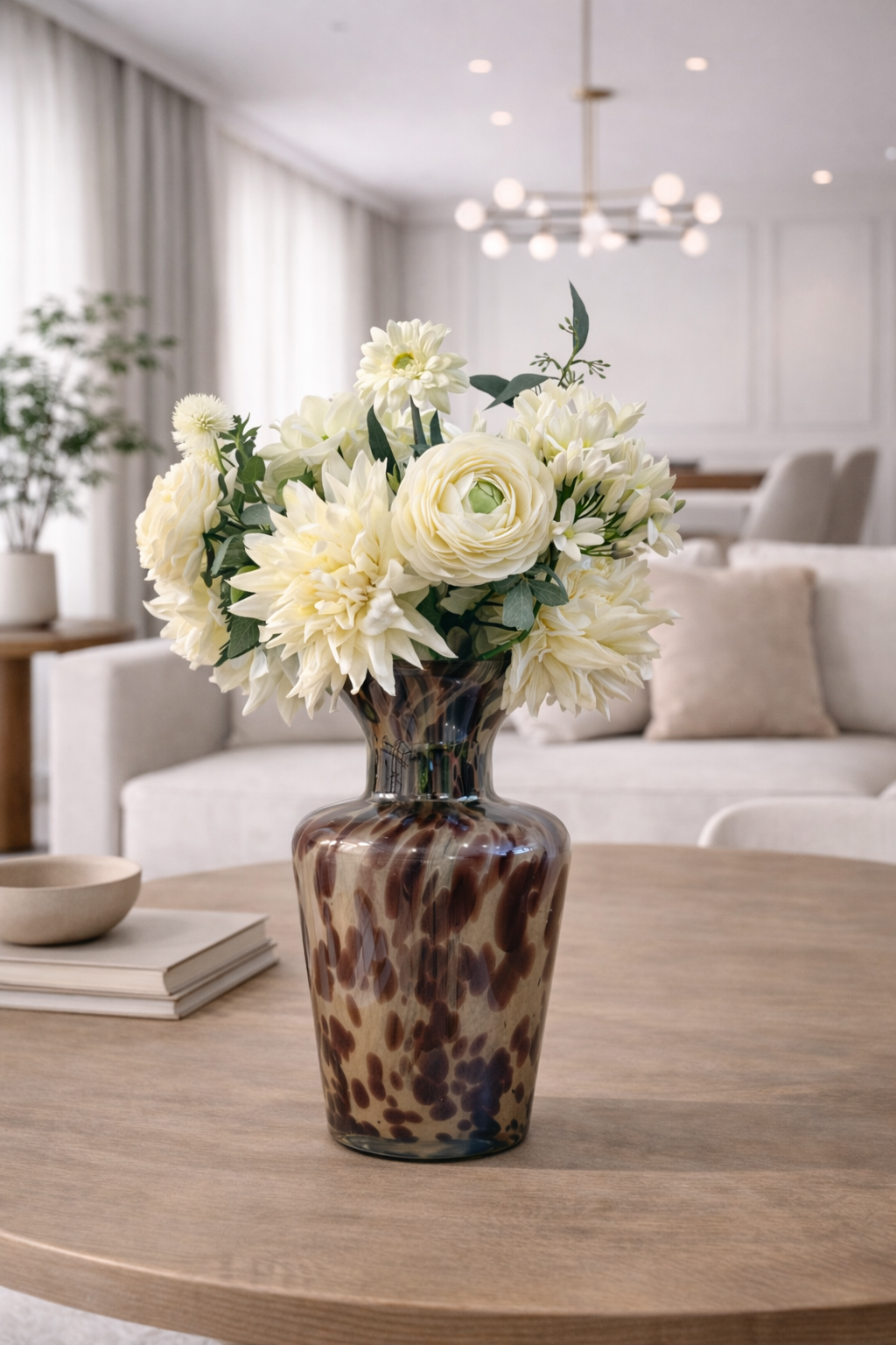 Fleurs et feuillages en tissus haut de gamme. Vase artisanale de style muranais, fabriqué en Italie dans les tradition du soufflage de verre.